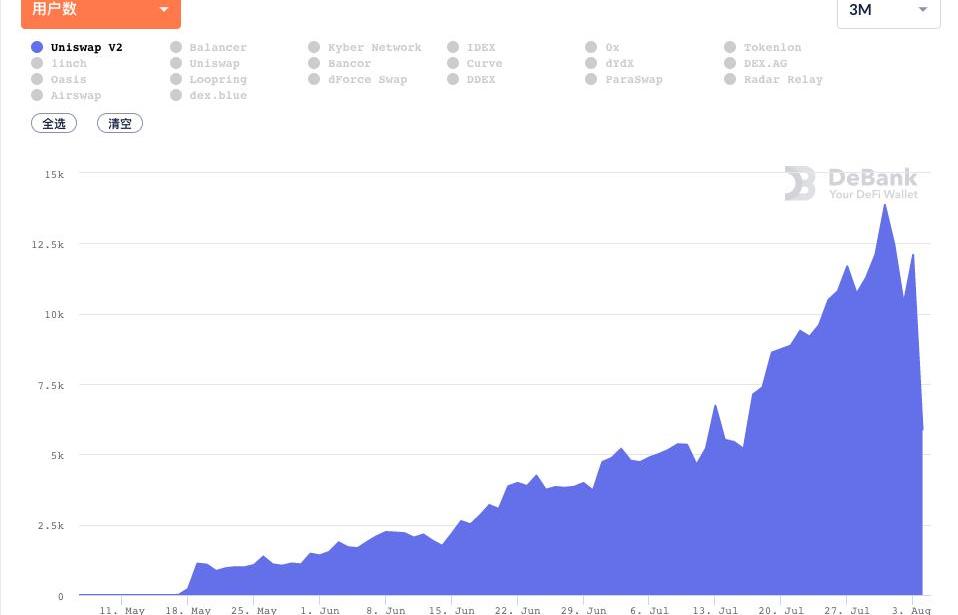 據DeBank數據顯示,Uniswap現在的日活有1.2萬人,而6月初還不到2000人,DeFi帶起了一波活躍用戶,但從圖上可以明顯看出,7月中旬開始,Uniswap的日活用戶量斜率開始越來越垂直。