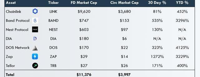 近日數據分析商Messari發布的一份新報告也表示,Oracle類項目代幣在今年大受歡迎,是2020年表現最好的加密資產之一,其中Chainlink(LINK)、Band和Nest等Oracle代幣今年實現大幅上漲。迄今為止Chainlink已上漲了400%,而Band、DosNetwork和Zap等代幣在過去一年里上漲了3000%到4000%。