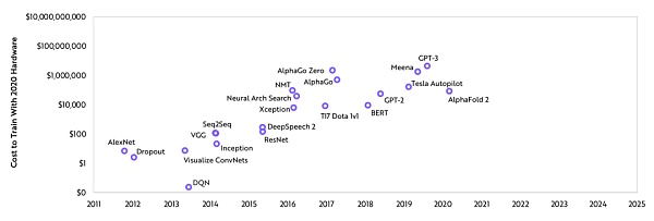 雖然硬件和軟件的進步使得AI的培訓費用呈每年下降37%的趨勢,但是AI的市場體量增長的更快,達到了每年10倍。結果就是,AI的總訓練費用不斷增加,遠遠超過了源自硬件、軟件進步所節約的成本。ARK認為,最先進的AI訓練模型的成本很有可能增加100倍,從目前的大約100萬美元提高到2025年1億美元以上。