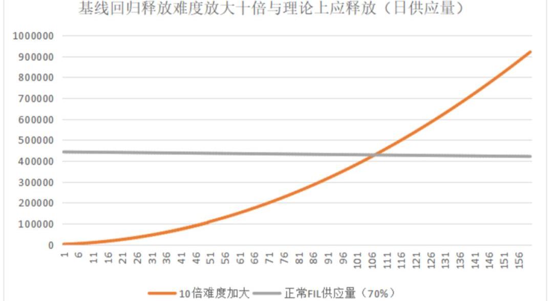 初始值為100PB、釋放量難度放大10倍與理論70%釋放供應量交匯圖,Y=×2880和Y日=70%×443037*0.999685T,來源:IPFS原力區,2020-08-10