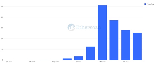 2020 年的月度轉賬數據始終呈上升趨勢,唯一的例外是流動性挖礦正熱火朝天的 9 月份。
