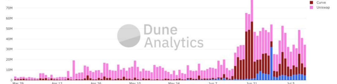 Uniswap、Balancer和Curve的交易額,來源:DuneAnalytics