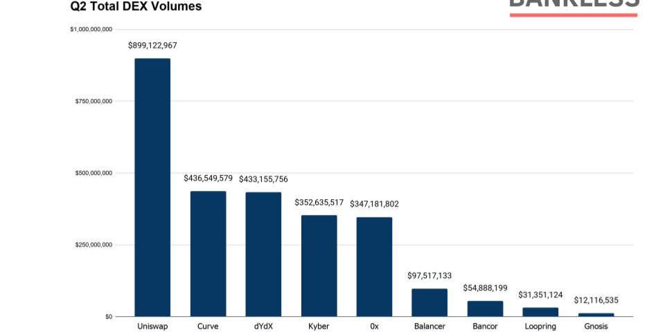 考慮到這一點,按季度交易量計算,排名第一的是Kyber和0x,它們在第二季度的交易量分別達到3.52億美元和3.47億美元。