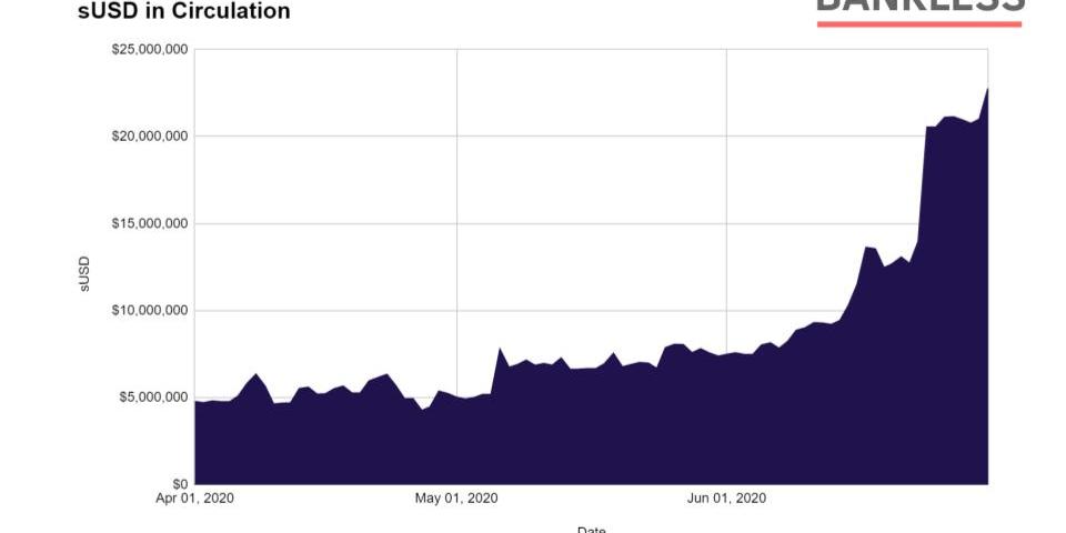 同樣重要的是,由于Synthetix的原生加密美元在第二季度增加了379%的流通供應量,總數達到2270萬美元,未償的sUSD數量正在創下新高。