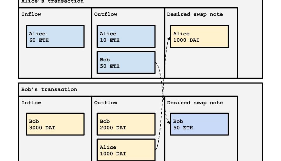 例如,愛麗絲想用天的50ETH交換鮑勃的1000DAI。