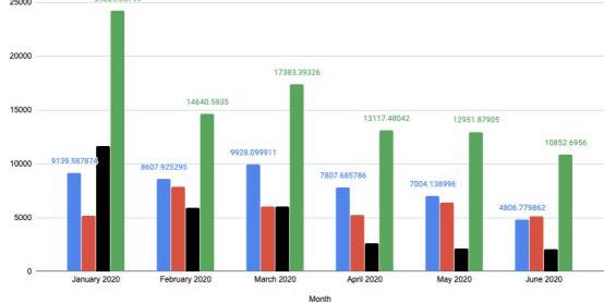 在過去幾個月時間里,飆漲的不只是穩定幣的市場總值,其總交易量以及活躍地址數也在快速攀升。根據CoinMetrics的數據顯示,從今年二月份開始穩定幣網絡的活躍地址數量呈指數級增長趨勢,并于6月7日創下歷史峰值,達2323690個。另一方面,在2020年1月到5月期間,穩定幣市場的月交易量從265萬筆猛漲至680萬筆,提高近三倍。雖然六月份該指標稍有回落,但依然遠高于年初的水平。