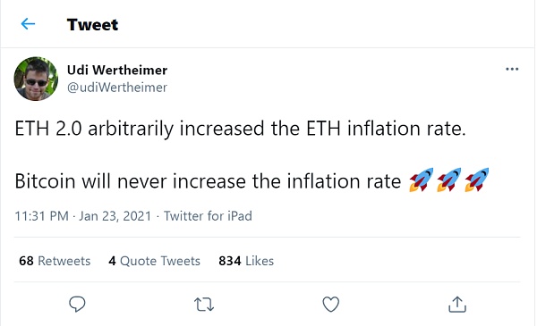 作為數字資產行業的班長,這次牛市的頭號馬車,比特幣不能示弱,其開發者Udi Wertheimer發推diss了以太坊,“ETH 2.0任意提高ETH通脹率,比特幣永遠不會提高通脹率”。