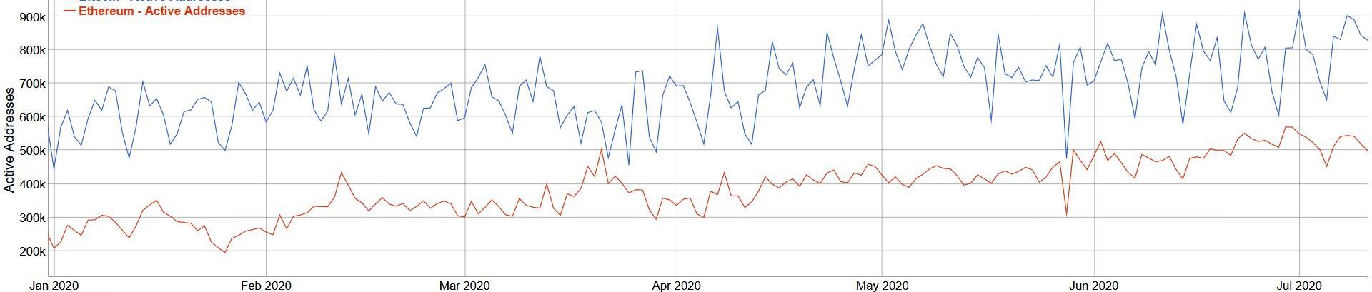 同時,比特幣的唯一有效地址數量同時增長了42%,從1月1日的585,047個上升到7月10日的832,751個。這與Messari的數據非常吻合,并證明了以太坊目前正在經歷興趣和活動高漲。