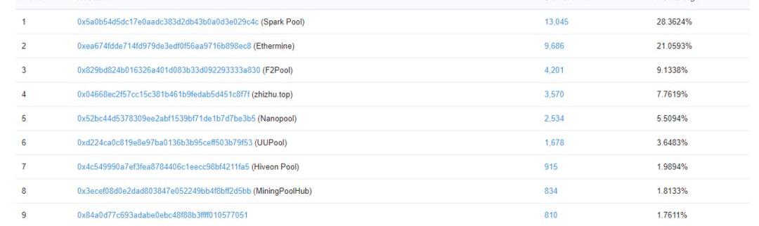 ETH產品的算力市場中,主要份額由Sparkpool,Ethermine,F2Pool,SpriderPool,NanoPool等礦池與小型曠工共同占有,其中SparkPool與Ethermine占據了約50.5%的算力市場份額。近1個月以來的礦工區塊市場份額分布圖如下所示: