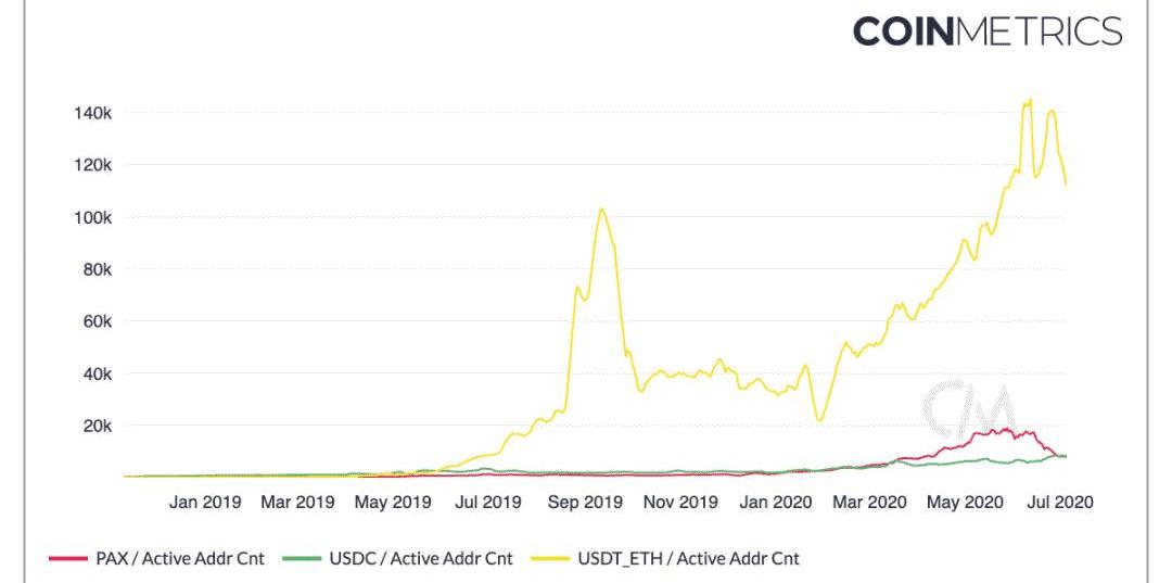 但盡管增長迅速,USDT_ETH的活躍地址似乎在6月達到了頂峰,進入7月后有所下降。PAX活躍地址也在6月初達到峰值,此后一直在下降。不過,并非所有的穩定幣都在下降。USDC活躍地址自3月以來相對穩定增長,目前已達到歷史新高。