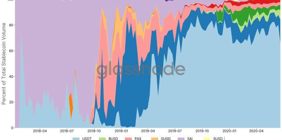 自2019年中期以來,USDT幾乎沒有競爭對手:2020年5月,以太坊上79.1%的穩定幣交易量通過USDT結算,其次是USDC,BUSD,DAI,PAX,HUSD,其他的穩定幣所占比例不到1%。