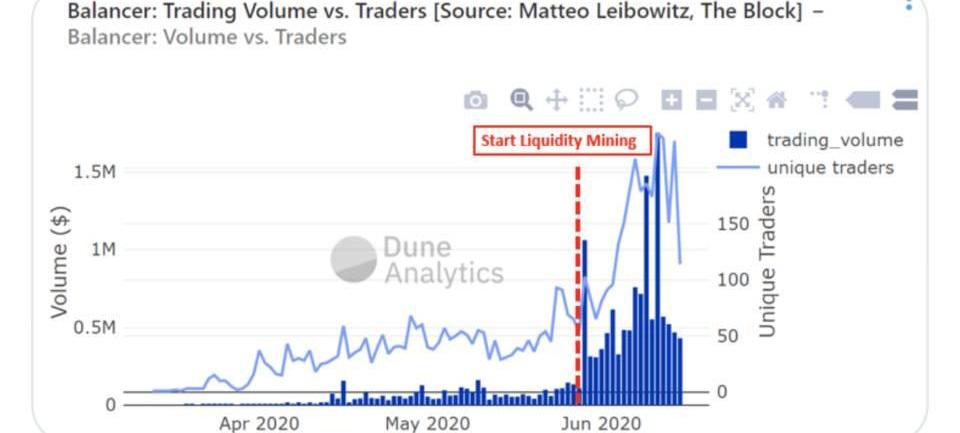 簡單來說,流動性挖礦通過代幣獎勵刺激流動性供應,這種方式可以促使流動性蓬勃發展并吸引更大交易量。這里我們列舉兩個成功實施流動性挖礦的例子,一個是Synthetix,他們在實施流動性挖礦之后sETHPool的流動性達到了Uniswap總流動性三分之一的水平;另一個例子是Balancer,在實施流動性挖礦一周之后,其網絡總鎖定價值達到了3000萬美元。
