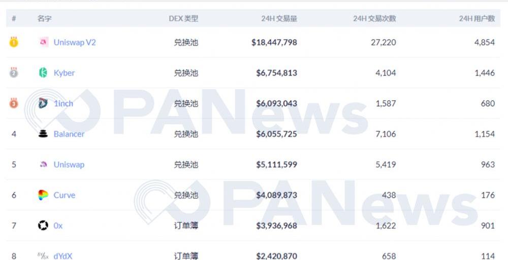 在以太坊網絡中,UniswapV2的成交量居于首位,遠遠超出其它項目。從下圖中我們可以看到,24小時成交量前6個都屬于兌換池類型。這也反應出區塊鏈在金融領域的作用——區塊鏈正在改變傳統的交易、結算方式。雖然Loopring等訂單簿類型的DEX也很火,并且在技術上作出了突破,但24小時交易量不足100萬美元。