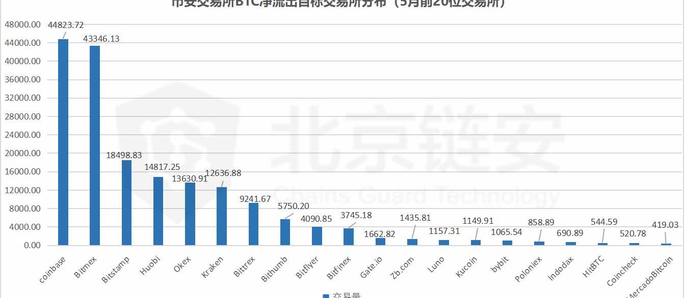 接下來,讓我們看看,在5月份,幣安、火幣、Okex交易所提出的BTC,又主要流向了哪些交易所呢?經過我們的分析,列出了可以識別的前20位交易所的數據。