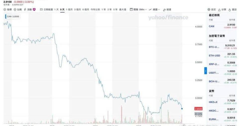 據雅虎數據顯示,5月22日,嘉楠科技開盤價為3.8美元/股,截至5月28日,嘉楠科技收盤價為2.91美元/股,跌破3美元/股,近一周跌幅為23.4%。值得注意的是,較其發行價9美元/股,已跌去三分之二,市值為4.6億美元。