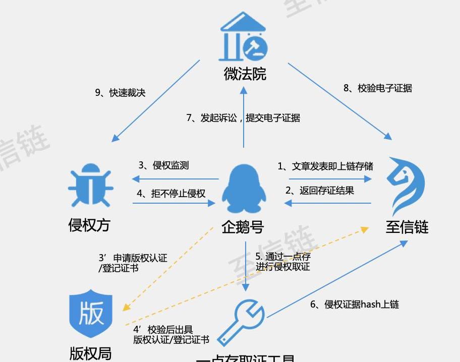 版權作品上鏈后也可以由作者自行選擇借助鏈上版權機構進行作品登記、作品認證等行為。當作品版權發生授權、轉讓、質押等權屬變動時,相關信息均可以在“至信鏈”上留痕,便于后續的信息溯源。作者還可以利用“至信鏈”所提供的版權監測服務,全網全品類全時段地對版權作品進行侵權監測,當發生侵權行為時,可以使用“至信鏈”所提供的版權取證能力固定侵權內容。后續當作者訴諸于法律維權時,可以將已固定的權屬信息及侵權內容作為證據騰訊主導建設的“移動微法院”平臺等網上立案通道直接提交至法院,法院可通過“微法院”進行在線訴訟,相關證據可以在至信鏈提供的證據校驗平臺進行。