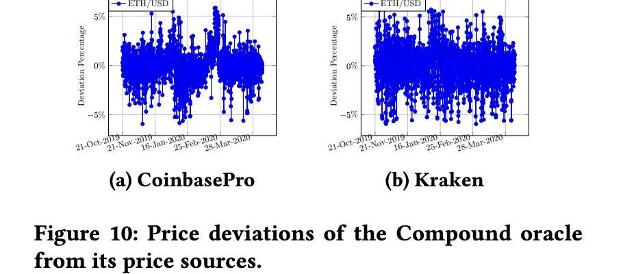 Compound的預言機使用Kraken和CoinbasePro作為其ETH/USD來源。我們對Compoundoracle進行評估,總共分析了2,144個事務,并將得到的結果顯示在圖10中。如我們所見,大多數偏差在4%以下,只有少數偏差在5%以上。