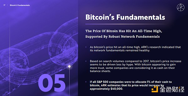 值得注意的是,其中第5和第6個“Big Ideas”都是比特幣方面的內容,分別從比特幣基本面以及機構對比特幣的配置方面闡述比特幣。ARK認為,比特幣市場和投資者群體正在走向成熟,比特幣應該在機構的投資組合中得到戰略性的配置。而且機構投資可能對比特幣價格有實質性影響。ARK分析發現,如果所有標準普爾500強公司都將1%的現金用于比特幣,比特幣價格將上漲約4萬美元;機構投資者在2.5%至6.5%之間配置其資產,可能讓比特幣的價格升至20萬美元到50萬美元。