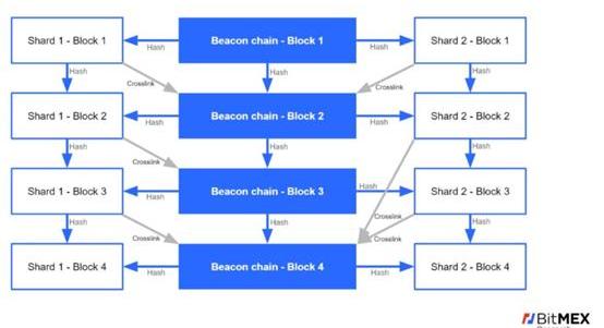 因此,信標鏈每個槽位只剩下一個驗證者委員會。每個分片區塊都包含一個最新的信標區塊的哈希值,并且。信標區塊可能包含了所有的投票數據,這些數據來自于分片。