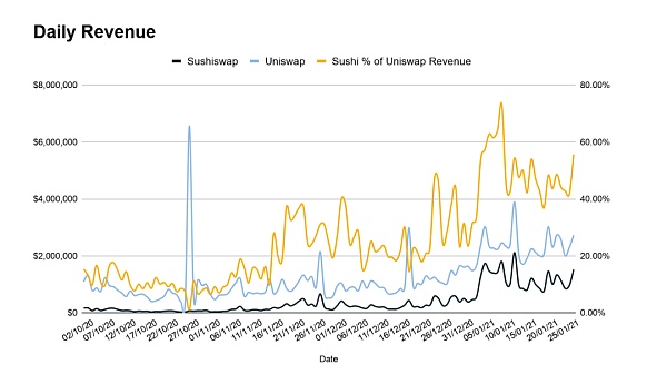 就在一個月前的 12 月,Sushiswap平均處理的交易量是Uniswap每周交易量的25%。現在,該協議的平均處理量達到了 Uniswap 交易量的 48%。
