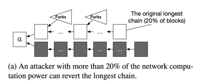 在中本聰協議中,過高的區塊生成速率會導致大量的區塊分叉,最長鏈增長速度緩慢,攻擊者更容易構造一條側鏈反超。