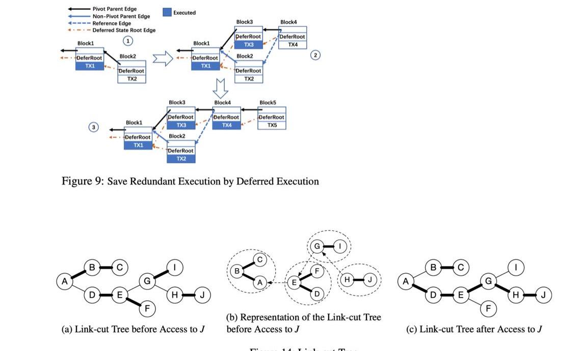 6.延遲執行:在高區塊生成速率下,GHOST規則所選取的主鏈末端往往是不穩定的。在trivial的實現中,每次主鏈末端“擺動”,區塊的順序都會發生改變,于是Conflux需要重新執行交易。這帶來了不必要的開銷。在延遲執行策略中,對于高度為x的主鏈區塊,區塊只需要執行高度x-c區塊之前的交易并填入賬本MerkleRoot中。c是一個經驗參數滿足:在系統正常運行時,主鏈上最后c個區塊以外的區塊,“擺動”的頻率很低。