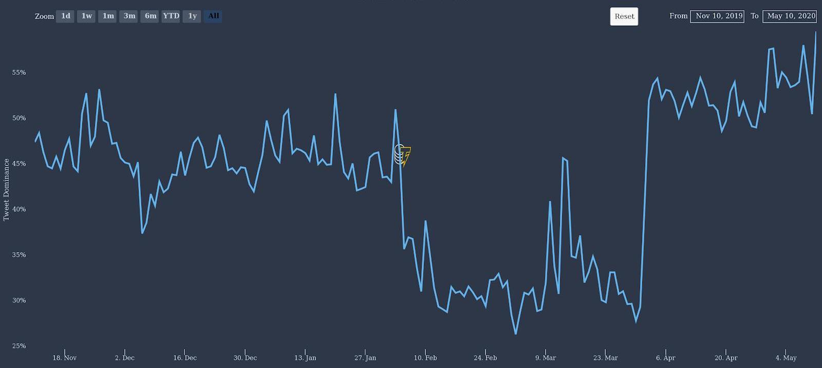 隨著減半臨近,比特幣的推文占比也飆升至6個月高位。
