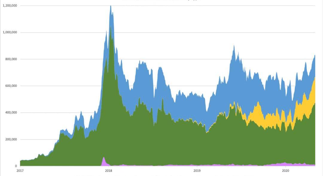 圖中的“OtherERC20s”(除ETH和穩定幣之外的其他代幣,即圖中底部的紫色區域)交易價值的幾次飆升主要是與代幣銷售有關。第一次飆升是在Augur項目進行代幣發售時期,其他幾次飆升包含了ZRX、Enigma、BNB、LEO以及Chainlink的代幣發售活動。但是,隨著代幣發售已經變得不那么受歡迎,以及那些僅將以太坊作為主網上線前的集結地的代幣進入了下一個階段,ERC20代幣的相對影響力已經下降,而穩定幣已經迅速躥升到前列。