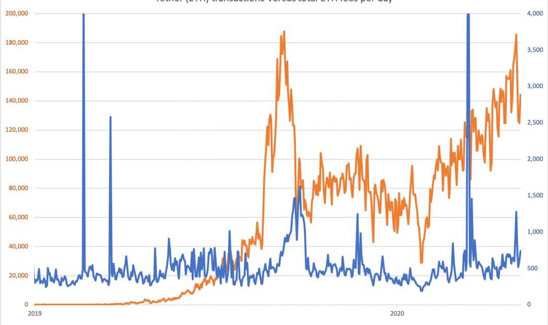 橙線表示以太坊網絡中的USDT交易價值,藍線表示整個以太坊網絡的交易費。請注意,2019年9月手續費大幅飆升表現為手續費壓力有所滯后;2020年1月的交易費由于?USDT?交易減少而陷入低谷;2020年4月隨著?USDT交易額再次回升,交易費攀升。當然,其他令人困惑的變量依然存在,但是對高價值交易的大量需求通常意味人們愿意支付費用,這也不是件壞事。