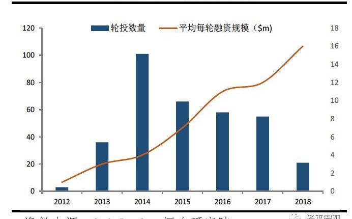 從全球區塊鏈相關公司融資輪次分布情況來看,超95%以上融資事件處于種子輪、天使輪及A輪階段,B輪及以后只占3%,這說明目前產業依舊處于早期階段。而2014年后VC融資輪投數量逐步減少,平均輪投規模逐漸增加,說明產業已經逐漸進入早期階段的尾聲。