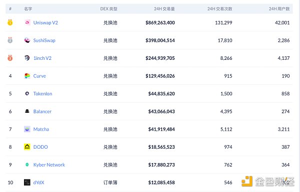 交易量排名前十的DEX 數據來源:Debank