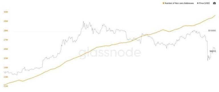 另一個顯示人們比以往任何時候都更看好比特幣的指標是非零余額比特幣錢包數量的上漲。這意味著,參與投資比特幣的人數比以往任何時候都多,而且這些用戶都至少進行過一筆交易。