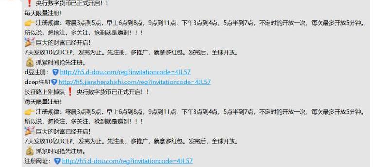 在這條消息里,發布人聲稱“央行數字貨幣已正式開啟,每天限量注冊”“7天發放10億DCEP”,同時提供兩個下載注冊鏈接,儼然是官方代言人的形象。