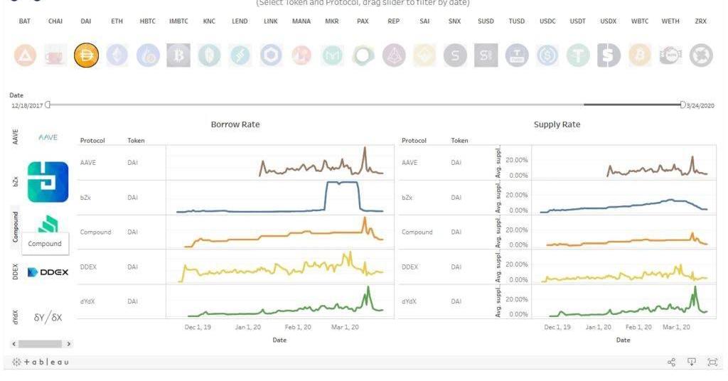 Alethio已為DeFi提供了視覺效果的儀表板。視圖和圖表包括鎖定在DeFi中的ETH,鎖定在DeFi中的Sai,Synthetix概述,DeFi利率,復合流動性等。視覺效果采用Tableau格式,可通過滑塊和濾鏡使視覺效果美觀并可自定義。