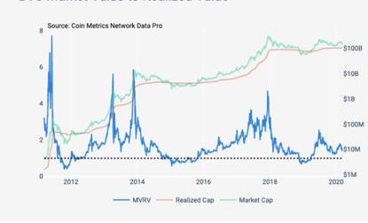 我們可以將MVRV看成是投機者和持有者對一個數字貨幣資產的估值比較。在這種解釋下,市值可以被認為是對投機者當前市值的估計。另一方面,實現價值市值是衡量了持有人對價值的估計,因為建立在最后一筆交易時的價格的基礎之上的,不受價格突然波動的影響。