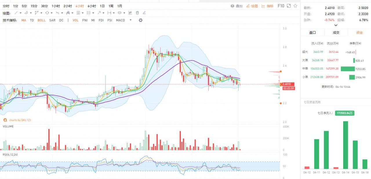 四小時K線,EOS在低點附近出現一個長中字,且伴隨一定的量能支撐,多頭搶單意愿較強。短時聯動ETH區間震蕩為主。