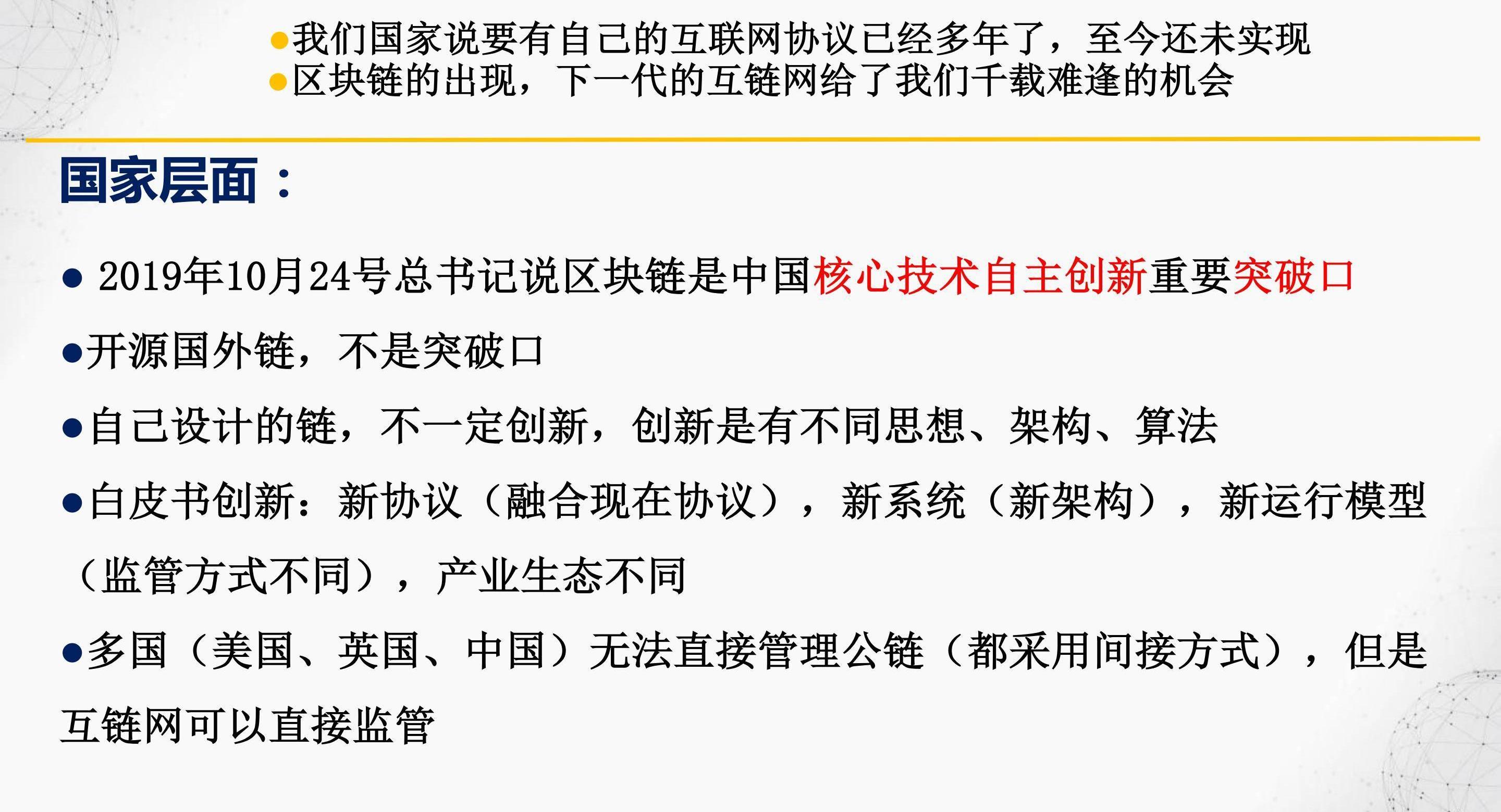 《互鏈網白皮書》里提到新協議,新系統,新架構,新運行模型,新監管方式,產業生態也會不一樣。多國包括美國、英國、中國都沒有辦法直接監管這些公鏈,都采用間接監管方法。但是如果有互鏈網,就可以直接監管和治理。