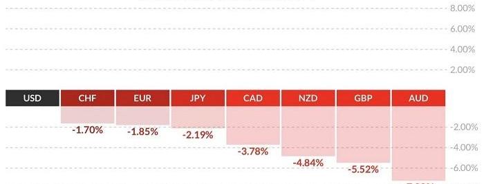 下圖是3月20日當周,美元相對于全球其他主要法定貨幣的表現。