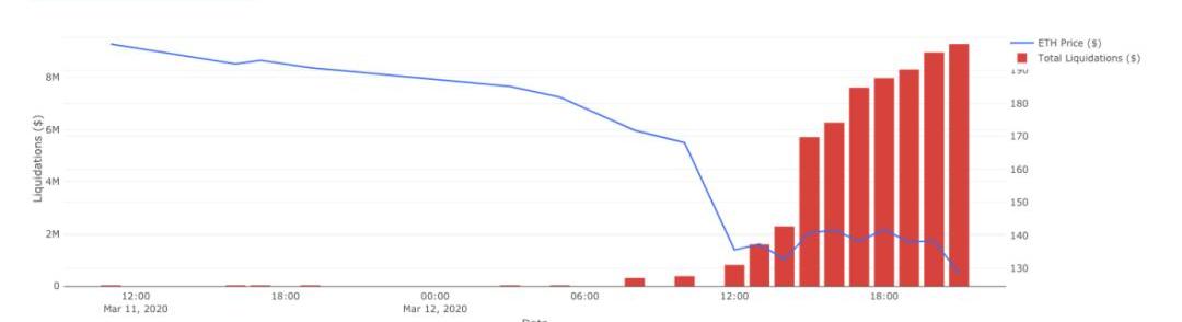2020年3月12日,MakerDAO?面臨史上最黑暗的一天。當天全球加密貨幣市場遭遇瀑布式暴跌,ETH大跌?50%,造成眾多交易所平臺和以抵押ETH為基礎的DeFi平臺清算頭寸,造成網絡的嚴重擁堵。由于MakerDAO中多數是以ETH為抵押品,當天承載了令人難以置信的工作量,需要在24小時內清算的貸款比其整個生命期已經清算的多了?10倍。