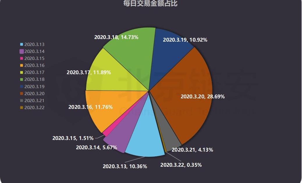 從轉賬交易活躍日來看,3月20日的轉賬交易最為頻繁,共計交易146次,各交易所接受金額總和145781890.91枚USDT,金額占比28.69%,交易次數占比18.94%。