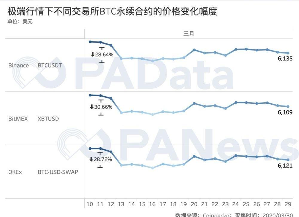 但從不同交易所的不同合約在極端行情下的價格跌幅來看,不同交易所中不同合約產品的深度又有所不同。從BTC永續合約來看,12日至13日,Binance的BTC永續合約跌了28.64%,OKEx跌了28.72%,BitMEX跌了30.66%。火幣BTC永續合約由于推出較晚,暫未被Coingecko納入統計。