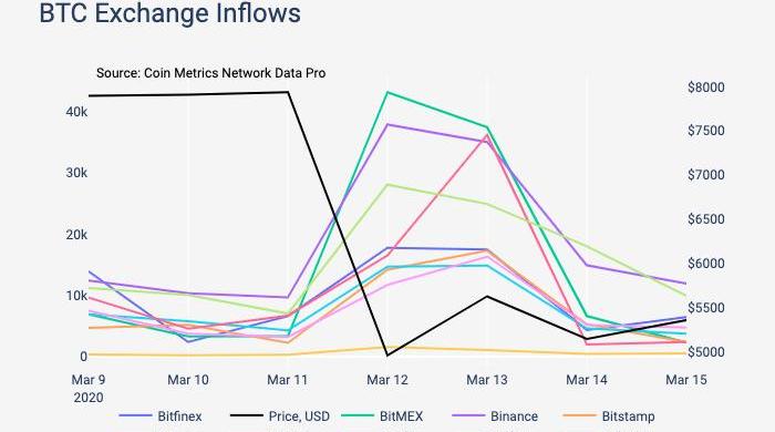 另外,3月13日當天,全網有超過16萬BTC流入了主流加密貨幣交易所,其中包括Binance、Bitfinex、BitMEX、Bitstamp、Bittrex、Gemini、Huobi、Kraken以及Poloniex,這是自2017年11月13日以來最大的單日流入量。