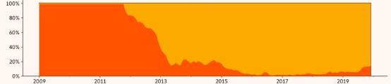 到2020年初,礦池的數量已減少至11個。但還沒有某個礦池可以控制絕對哈希率,且與2017年和2018年相比,2019年頂級礦池之間的競爭愈加激烈,這同樣表明BTC網絡仍然是安全的。