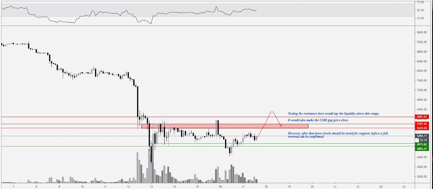 今天早些時候,Cointelegraph的撰稿人MichealVandePoppe發布了以下圖表,并解釋說,測試6000美元和6400美元之間的阻力,將進一步測試市場流動性,并縮小5900-6000美元之間的CME缺口。VandePoppe預計比特幣的上漲勢頭將在6000美元或6300美元時被阻擊,他解釋說: