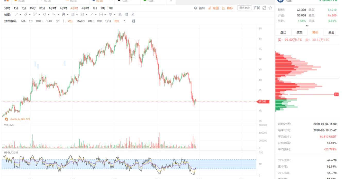 LTC最低觸及46美元,短時釋放的量能和前次大跌相當,短時企穩反彈的可能性較大。上方點位,先看是否能站上53美元,而后續58美元附近的籌碼承壓明顯。