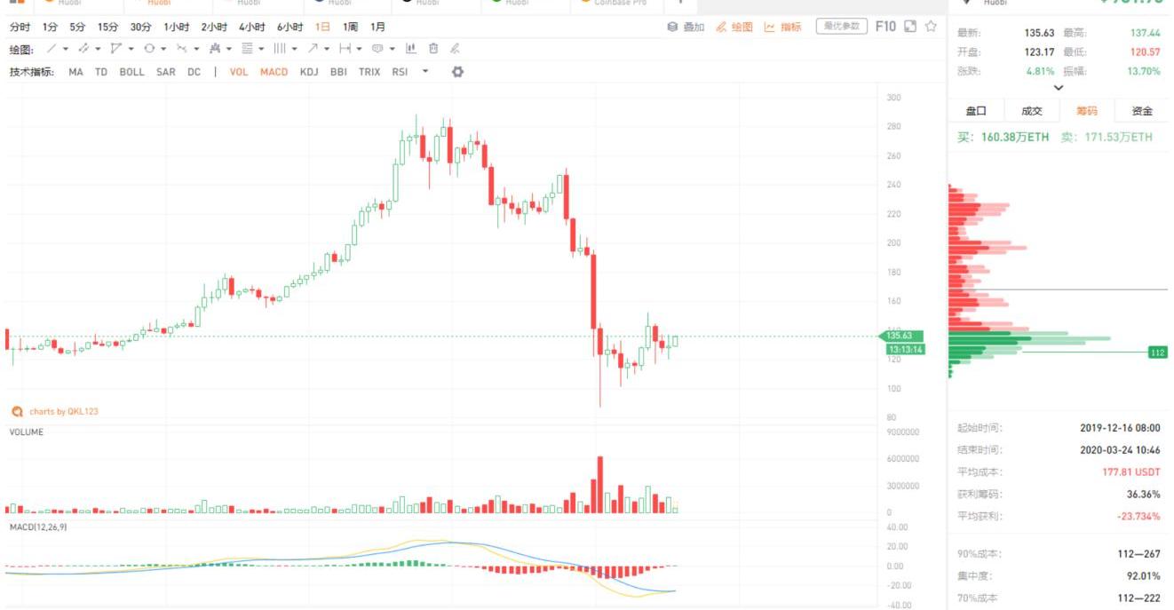 昨晚八點,在美股開盤一個半小時前,美聯儲宣布新一輪救市計劃,比特幣在隨后的一小時內直線拉升8.24%,且伴隨放量明顯。接著第二根一小時K線的放量與前一根接近,最高觸及6600美元后回落。日線MACD出現金叉,上行空間有望打開,但是上方一帶積累大量套牢盤承壓較強,7000美元附近是近期關鍵位置。
