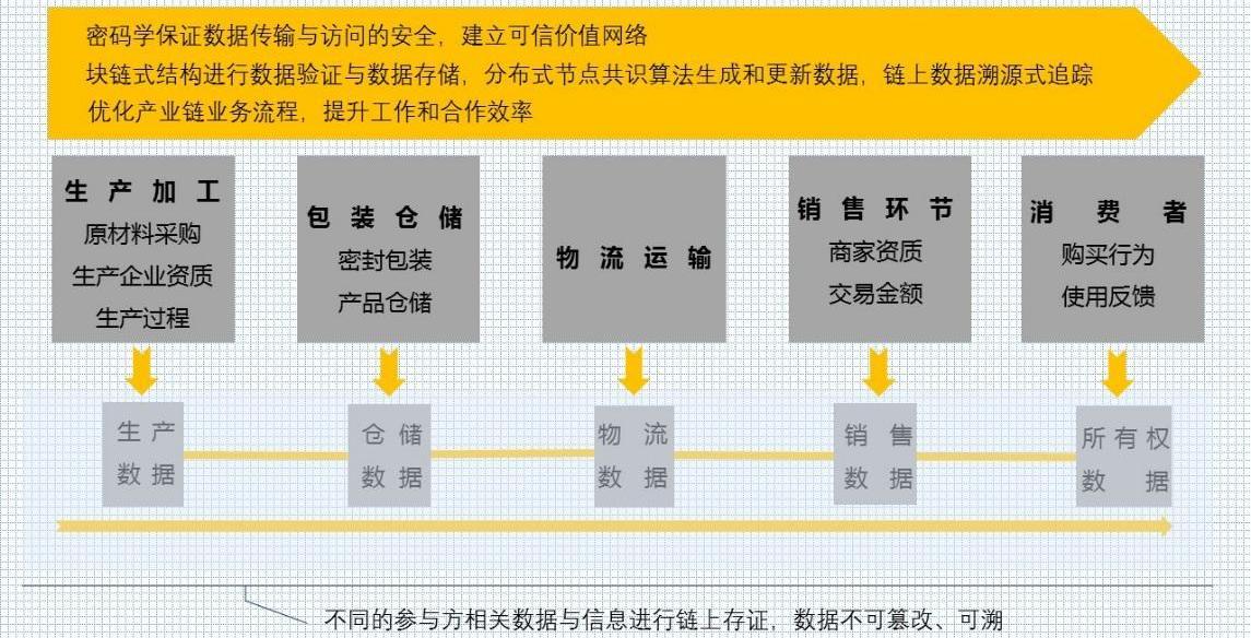 區塊鏈技術可有效地實現信息全程可溯,建立基于規范與協議,且不依賴于第三方的系統。在該系統內,記錄原材料采購、生產、物流、倉儲、分銷等數據,所有節點對系統內的數據進行安全驗證、存儲和同步更新,能夠跟蹤產品質量、記錄產品銷售。