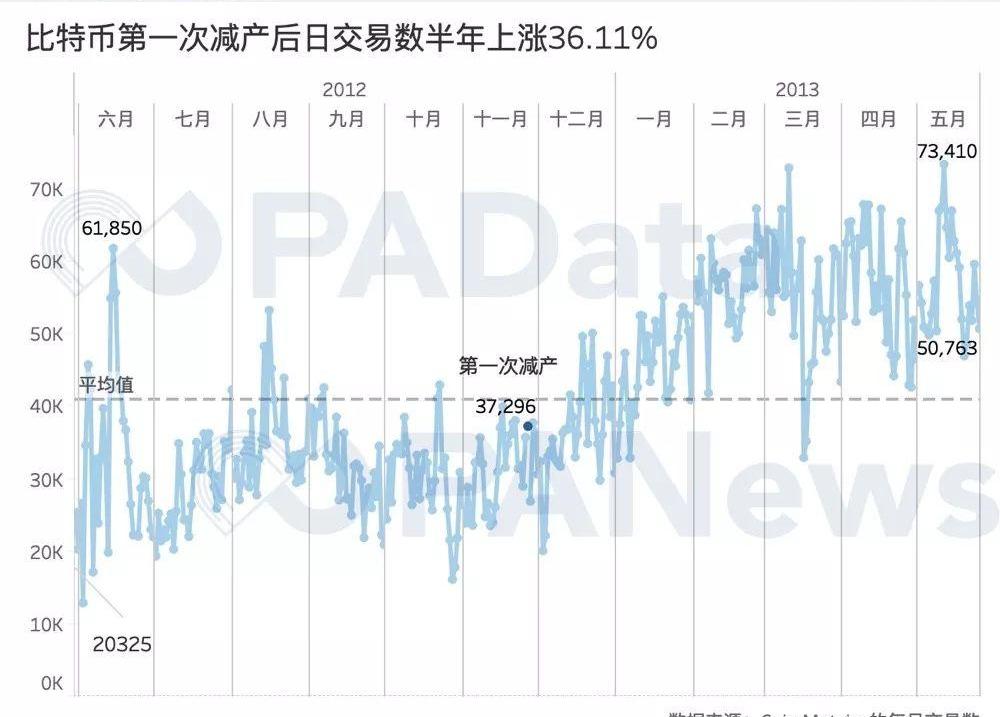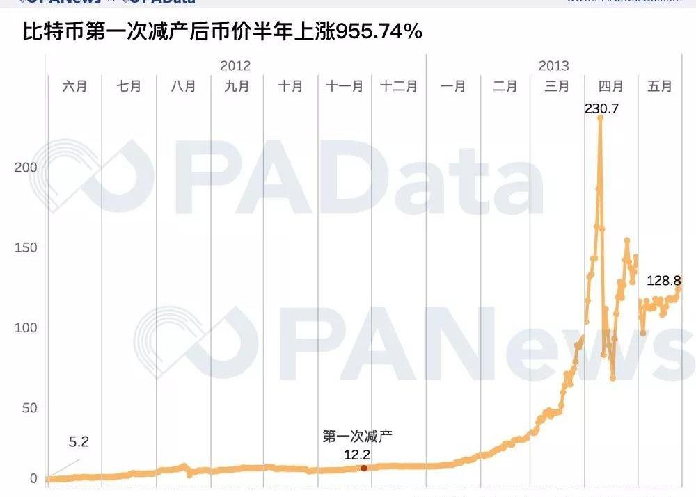 根據統計,2012年第一次減產時,比特幣的幣價為12.2美元,減產前半年的漲幅約為134.62%。減產后半年,比特幣的幣價達到了128.8美元,漲幅約為955.74%,最高達到了230.7美元,最高漲幅約為1790.98%。
