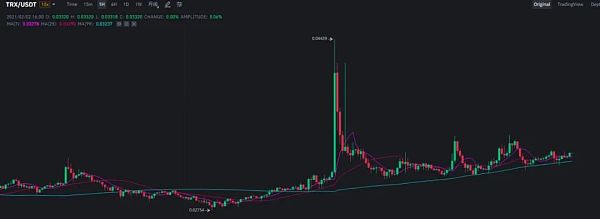 當然即便出乎意料,“WSB效應”還是彰顯了它的威力,就在消息宣布后,TRX 從 0.033 USDT 一度拉升至 0.042 USDT,5 分鐘漲幅 27%。