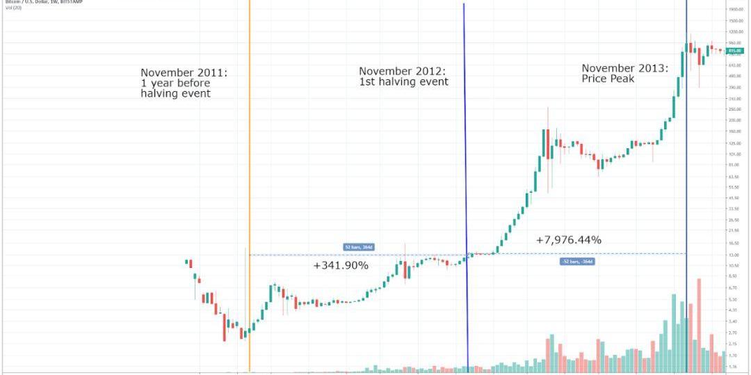 第一次減半發生在2012年11月份,BTC的每日產量從每天約7,200BTC降低到每天約3,600BTC。BTC在減半前獲得341.9%的漲幅,減半后獲得7976.44%的漲幅,并在2013年11月下旬達到了1,000美元左右的階段頂點。